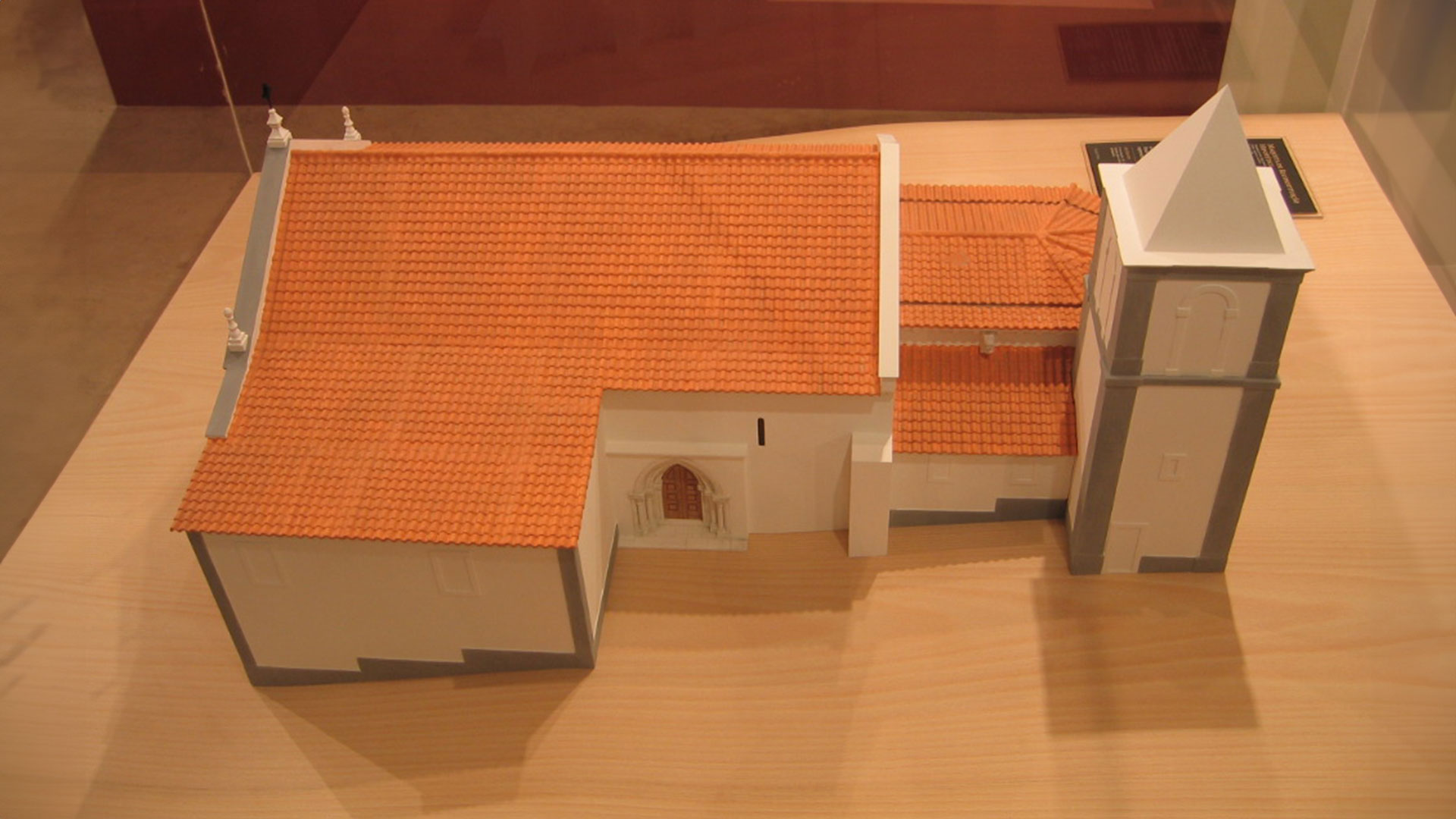 A maqueta exposta assume-se como a representação conjetural e concomitante de duas das fases construtivas do edifício, entre os séculos XVI (construção de contrafortes laterais para colocação de teto abobadado no alçado norte) e XIX (edificação de corpos laterais: torre sineira; Casa da Irmandade do Santíssimo; edifício lateral de funcionalidade desconhecida, no alçado sul).